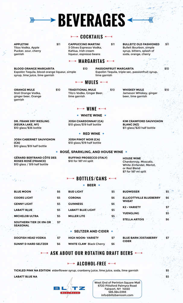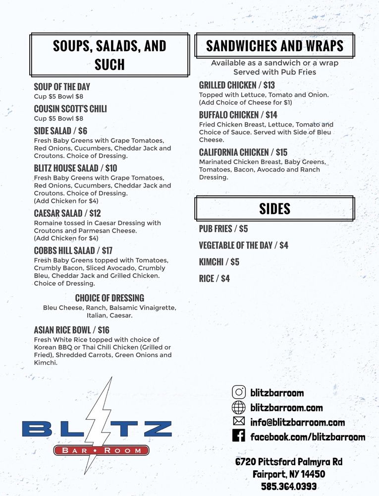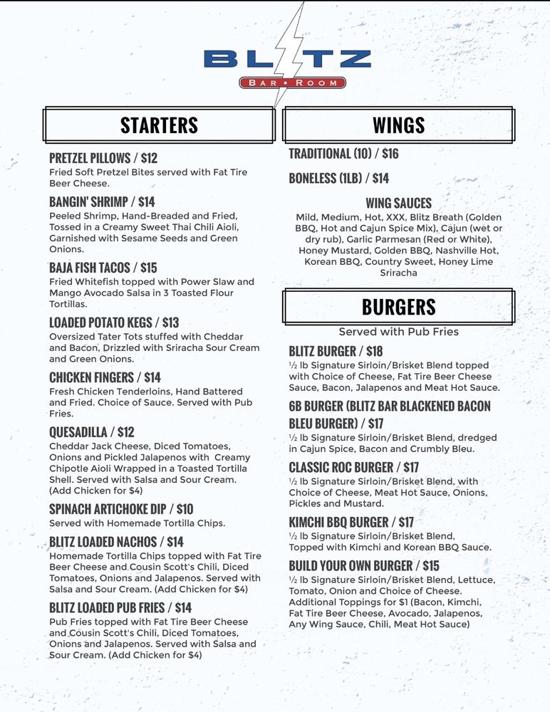 Introducing the menu at Blitz Bar Room, where burgers and sandwiches take center stage in a vibrant sports bar atmosphere. Located at 6720 Pittsford Palmyra Rd, Fairport, NY, this new hotspot is quickly gaining popularity among locals. The menu features an array of hearty options, from deep-fried pretzel pillows paired with surprisingly good beer cheese to flavorful burgers crafted for any palate.